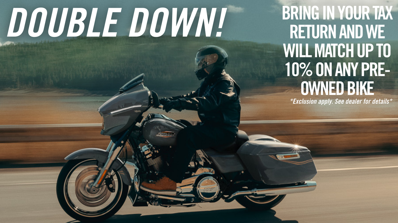 Bring in your tax return and we will match up to 10% on any pre-owned bike. *Exclusions Apply* See dealer for more information. Ends 2/28/2026
